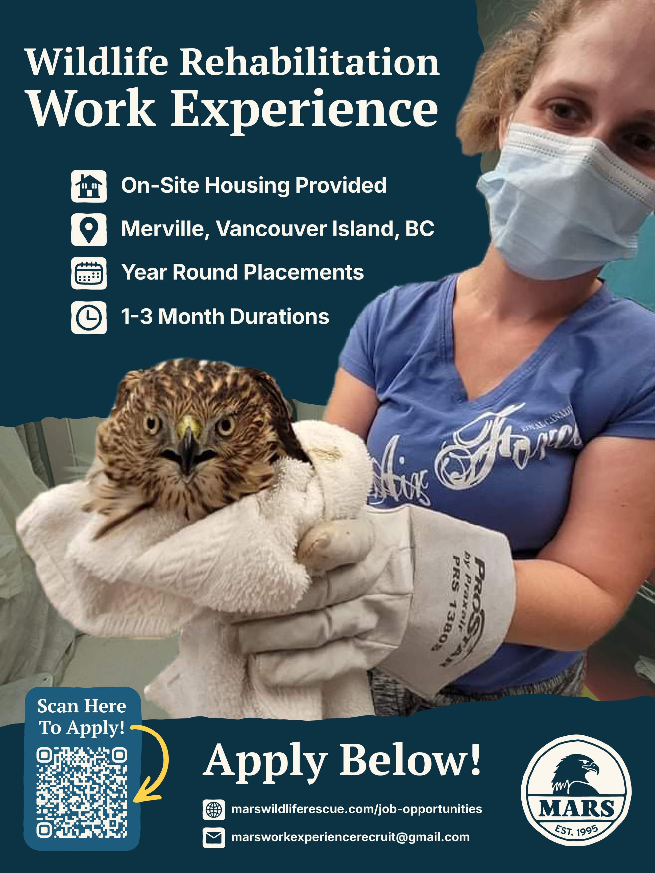 Join a guided tour for individuals or groups, Friday to Sunday, 10:00 am to 2:00 pm. Preplanned visits from classes and community groups are also welcomed. Learn how MARS rescues, rehabilitates, and educates.