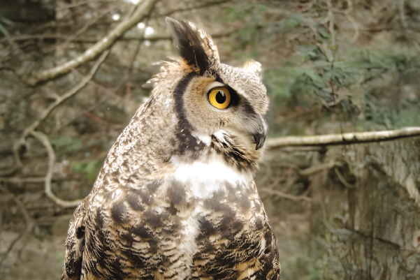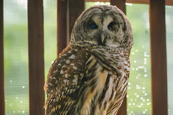 Originally, Shakespeare was adopted by MARS as a foster parent to younger Barred Owls but he wasn’t very good in this role. He started training to become an Ambassador bird in 2006 and made his first public appearance six months later. He could often be heard calling to local wild owls late in the day, even making “howler monkey” calls on occasion. His diet was mostly quail and mice.