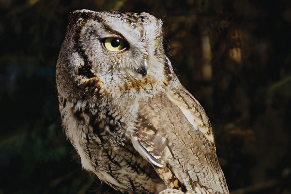 Western Screech owls in captivity have a life expectancy of about 15 years. He eats one mouse each day and weighs 175 – 250 g. Lanei is a very quiet bird with a very sweet personality, and usually keeps his ear tufts down, so he often presents himself as a very well-rounded owl!