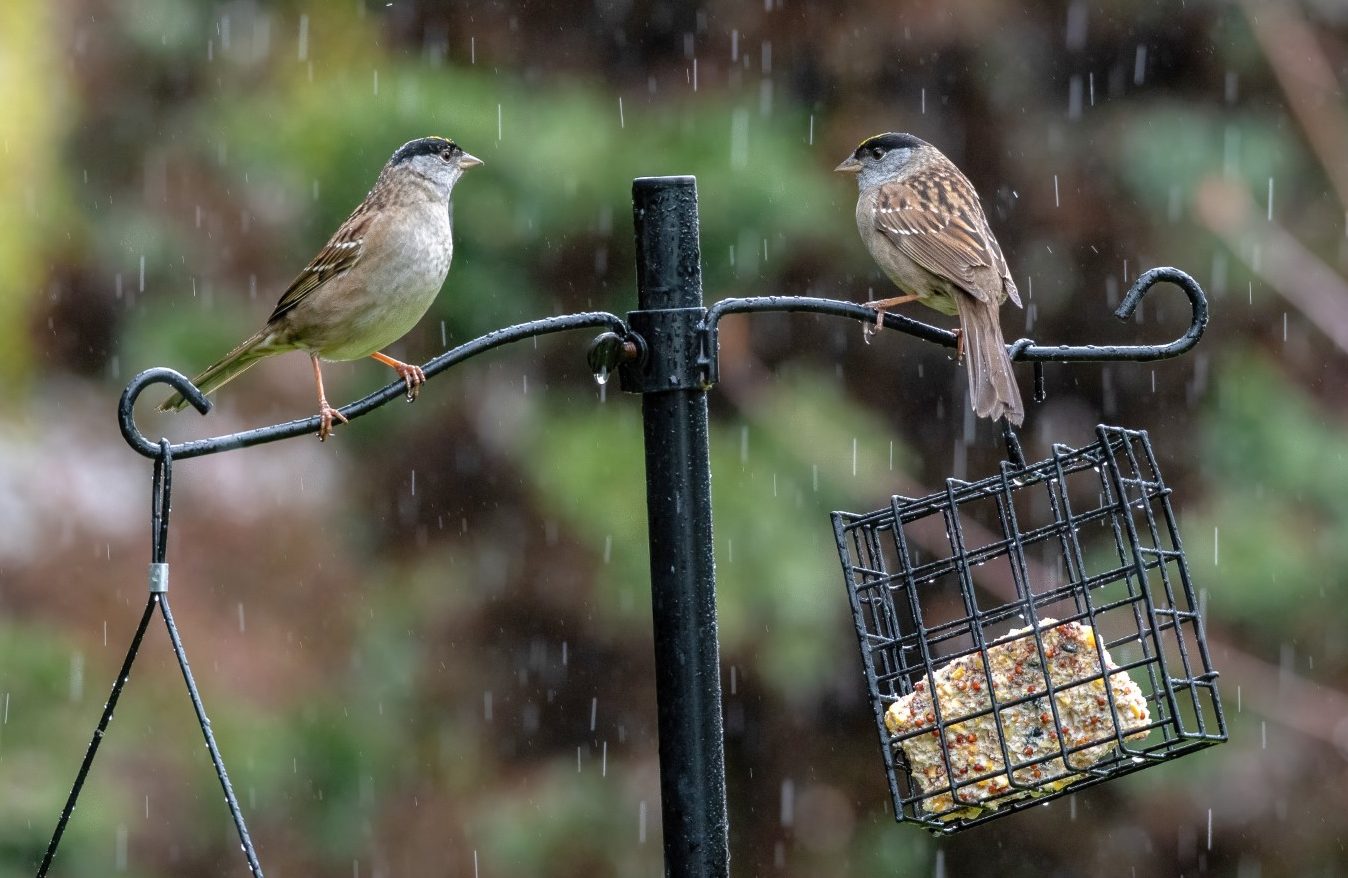 Stick to quality seeds like black sunflower seed or Nyjer seed. Watch for fillers like corn in lower-cost bird food. Don’t offer bread, salted nuts, or use salted fat in suet feeders. Consider separating the different types of food offered to decrease interaction between different species.